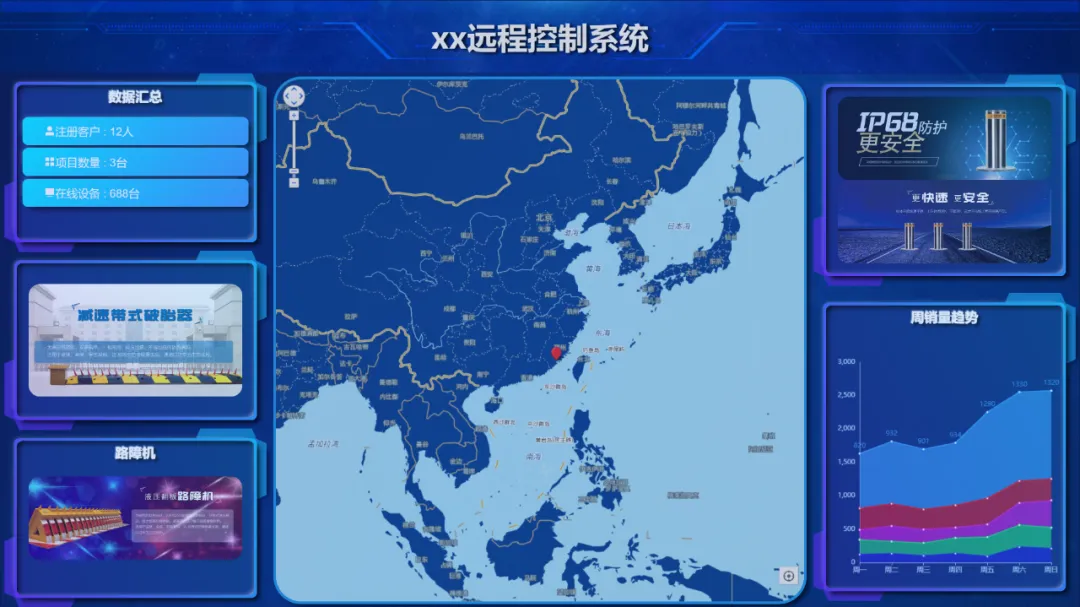 各个项目通过地图进行分布显示,可根据当前用户权限进入对应的设备监控画面;